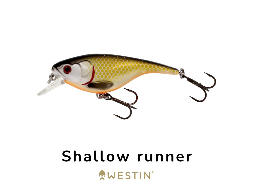 Mělký Shallow Runner crankbait. Neutrálně vyvážený (suspending) – když přestanete navíjet, neklesá ke dnu ani nestoupá k hladině. Ponor: 1–2 m.