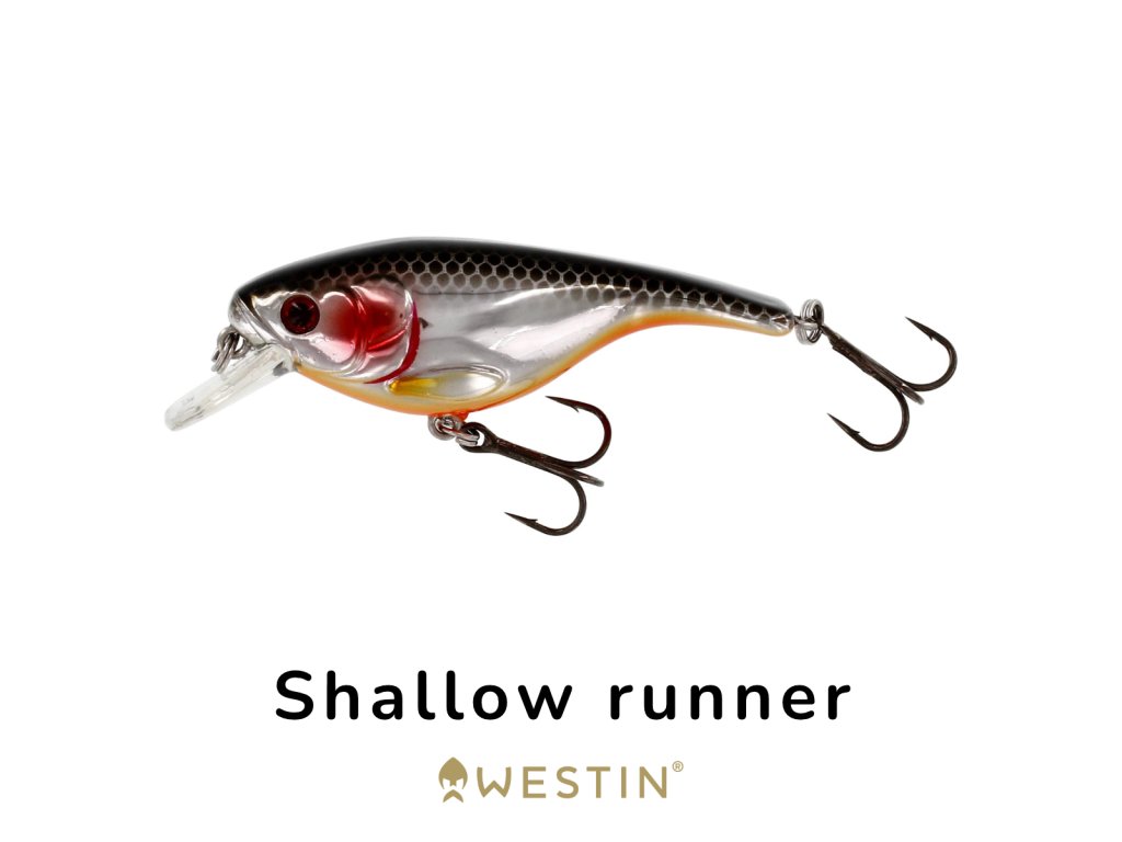Mělký Shallow Runner crankbait. Neutrálně vyvážený (suspending) – když přestanete navíjet, neklesá ke dnu ani nestoupá k hladině. Ponor: 1–2 m.